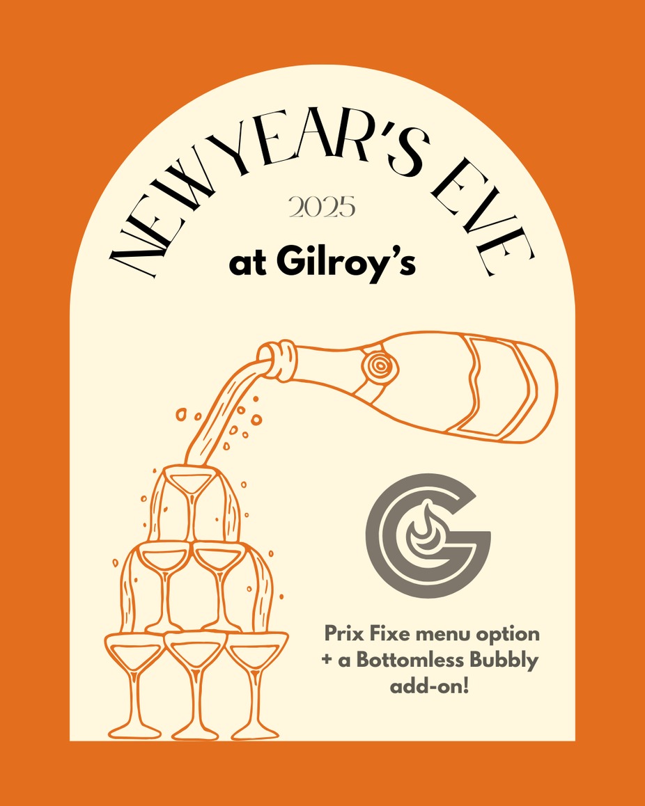 Make Gilroy's your first (or last, if you're an early bird) stop this New Year's Eve! Enjoy our Prix-Fixe menu option and a Bottomless Bubbly add-on.
