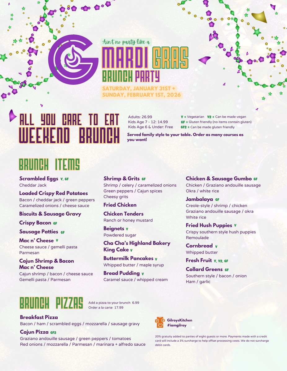 Celebrate Mardi Gras with a feast for the senses! Enjoy a vibrant brunch filled with New Orleans–inspired dishes, sweet King Cake treats, and festive cocktails. Colorful, flavorful, and full of fun—bring your friends and let the good times roll!